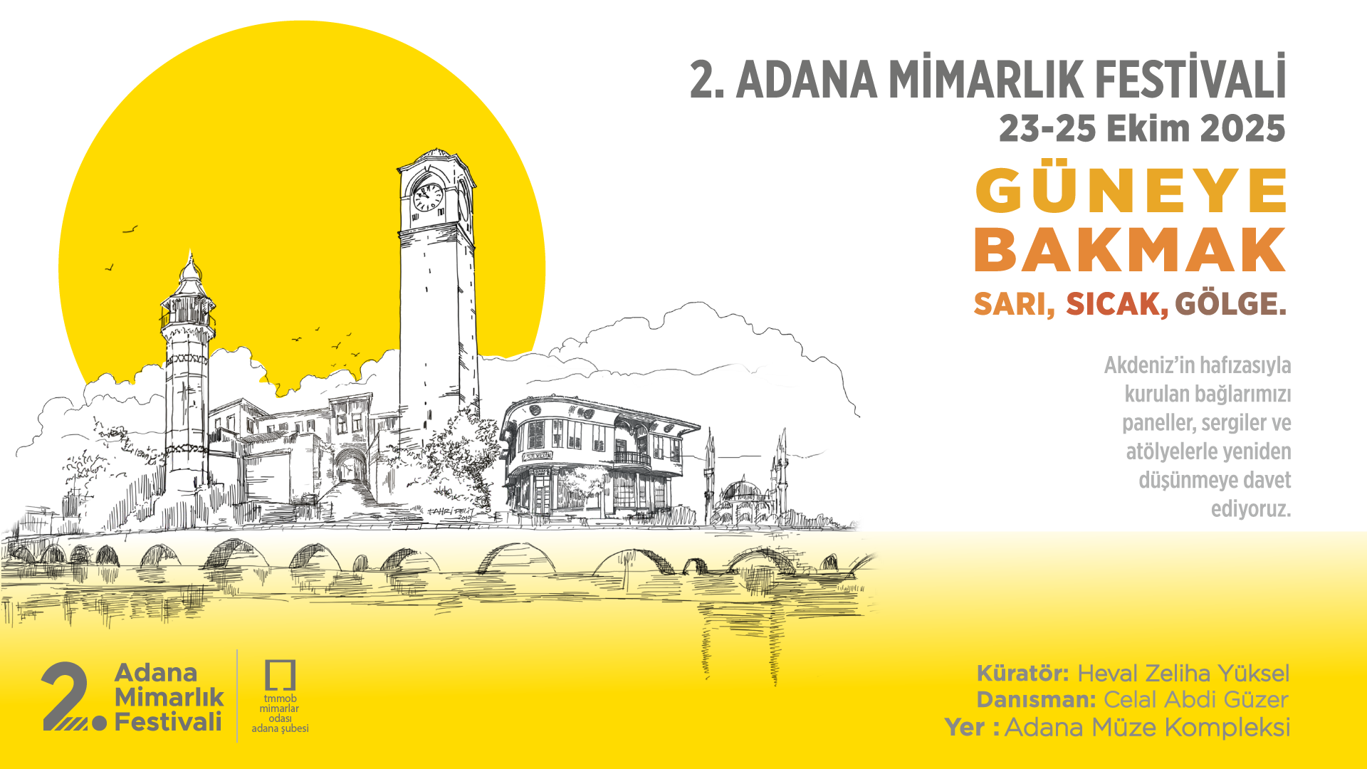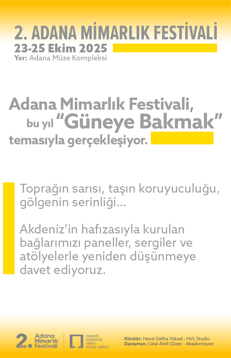 23–25 Ekim 2025 tarihlerinde Adana Müzesin'de düzenlenecek festival, “Güneye Bakmak” temasıyla mimarlık, sanat ve tasarım dünyasından isimleri buluşturuyor.